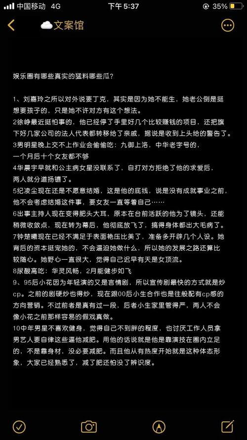 4. 明星私生活:明星的私生活,如家庭、感情、生活习惯等,也是娱乐圈猛料爆料的常见类型。